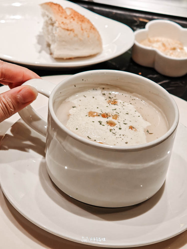 湯品這次我們點了雞肉巧達濃湯。這濃湯是用雞肉和多種蔬菜熬煮的,湯頭濃郁滑順,還帶有鮮甜的海鮮風味,熱熱的喝下去非常暖胃。