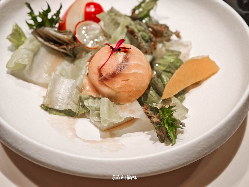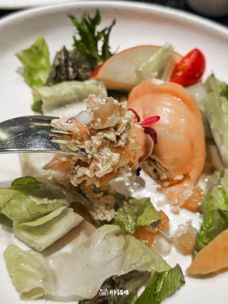 煙燻鮭魚乳酪沙拉擺盤精緻,煙燻鮭魚包裹著香濃的乳酪,口感清爽且層次豐富,當作前菜非常開胃。