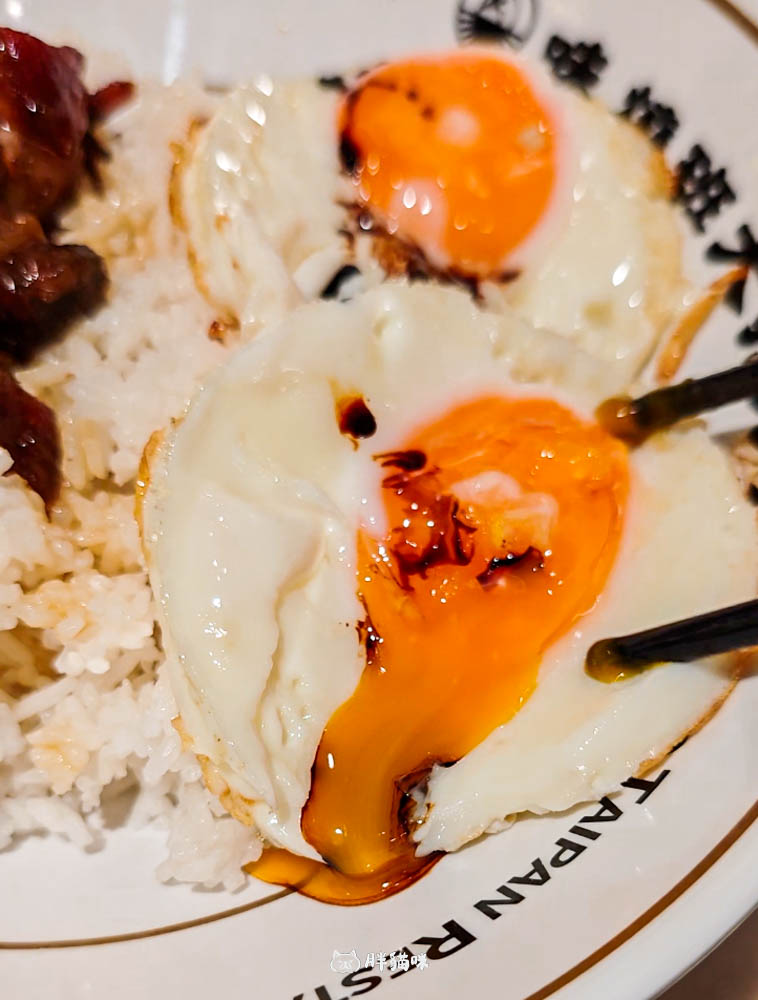 邪惡煎雙蛋!兩顆完美的半熟煎蛋覆蓋在飯上,蛋黃飽滿,輕輕一戳,金黃的蛋液就像瀑布一樣緩緩流下,與熱騰騰的米飯和燒味醬汁融為一體,那畫面光看就讓人忍不住吞口水!