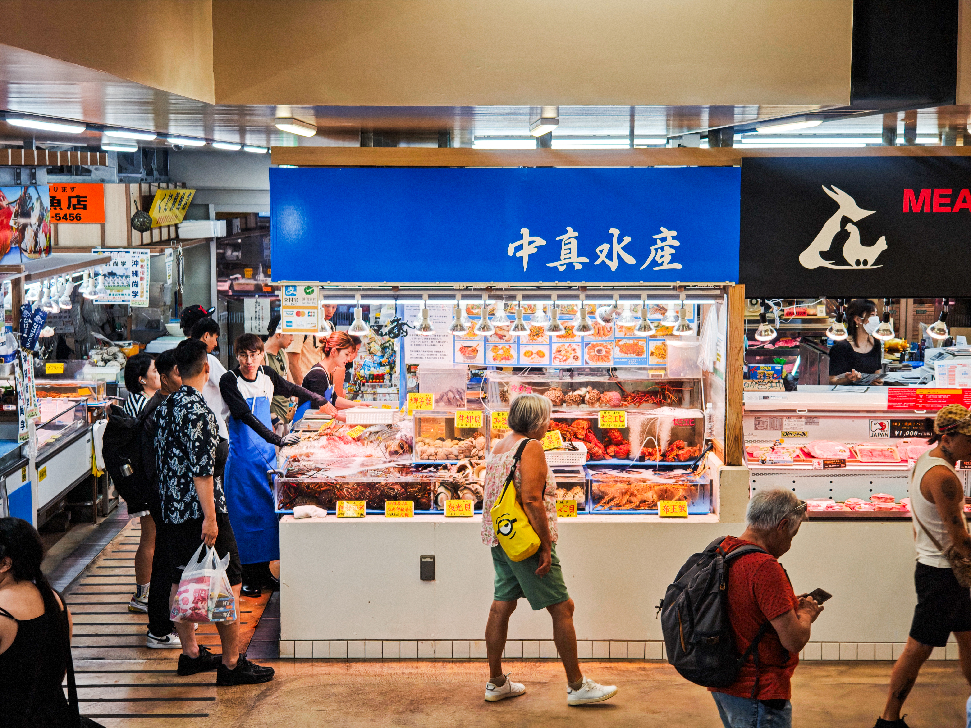 第一牧志公設市場最吸引人的地方,就是它獨特的「一樓選、二樓煮」消費模式。這讓我立刻想起韓國釜山的札嘎其市場,但這裡的環境更勝一籌!