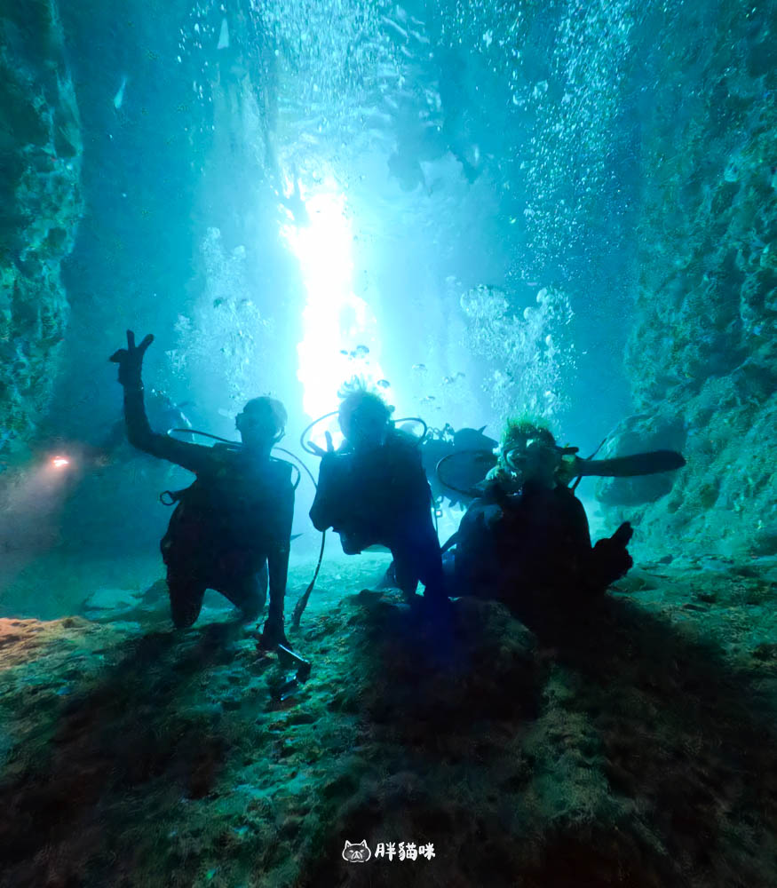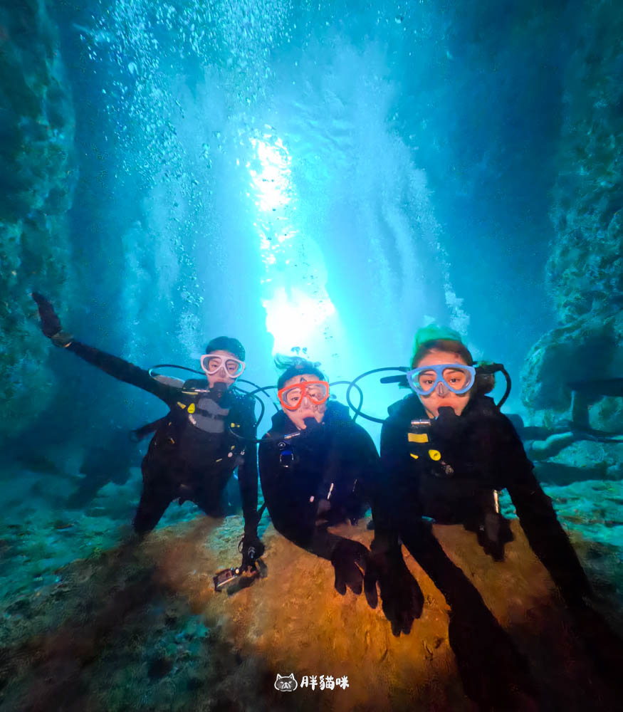 當教練帶著我們潛入水下,轉身進入洞窟的那一刻,那片由海底沙灘反射出來的神祕藍光,真的讓人屏息。它不是死板的光束,而是一種充滿生命力的流動藍色光暈,彷彿進入了另一個次元。