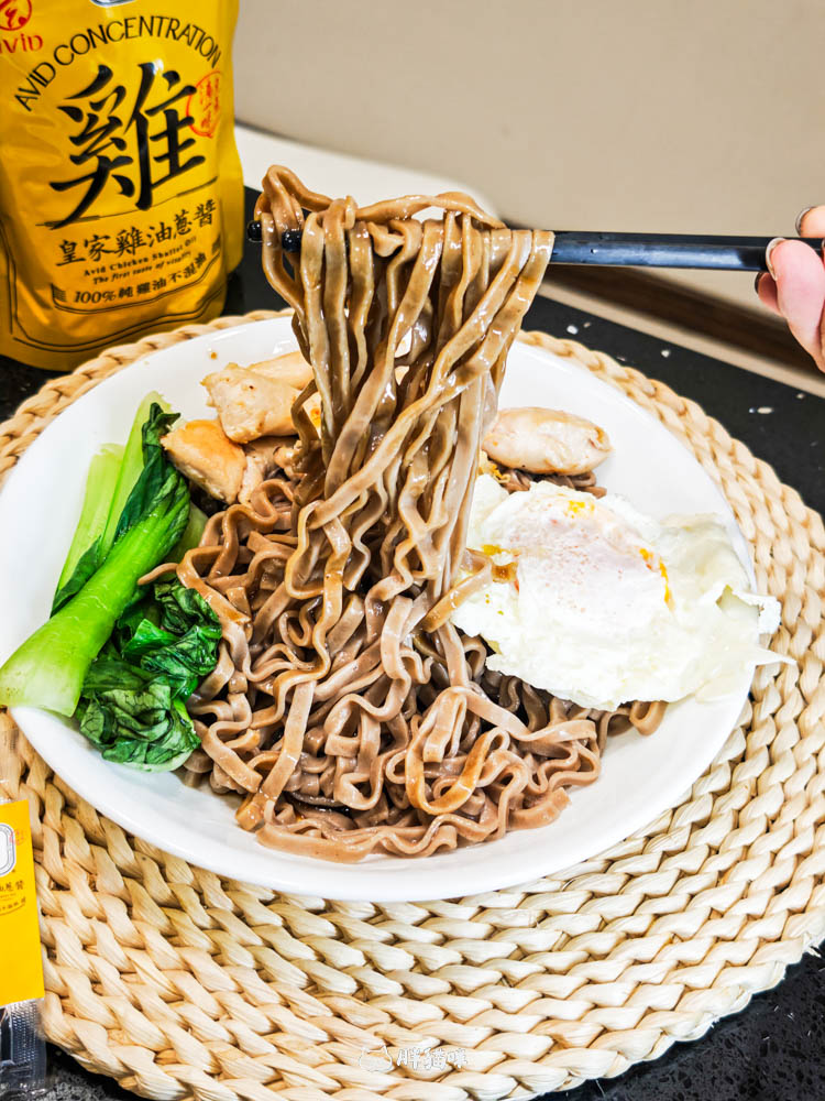 煮好麵條後瀝乾,趁熱淋上整包皇家雞油蔥醬,快速拌勻!那股濃郁的雞油香氣,搭配紅蔥酥的脆感,簡直是銷魂兩個字!再配上燙青菜補充纖維、里肌肉補蛋白質,以及金黃半熟蛋液,一碗兼具美味與健康的懶人餐就完成了!